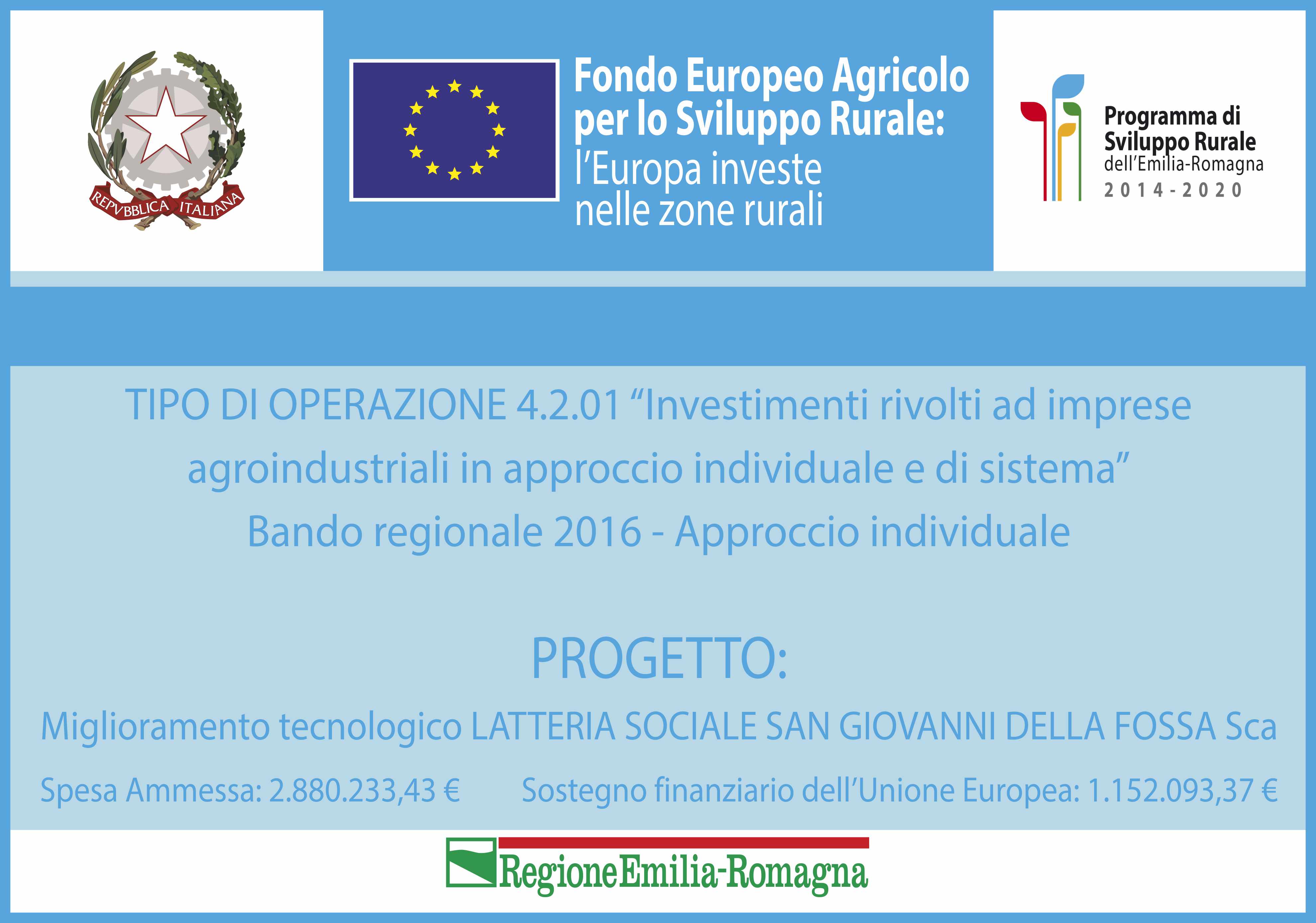La LATTERIA SOC. SAN GIOVANNI DELLA FOSSA S.c.a. ha ottenuto l’approvazione di un progetto agevolato nell’ambito dell’operazione 4.2.01 del PSR Emilia-Romagna 2014/2020 ed è dunque beneficiaria di un sostegno finanziato dall’Unione Europea attraverso il FEASR (link: https://eur-lex.europa.eu/legal-content/IT/LSU/?uri=celex:32013R1305).